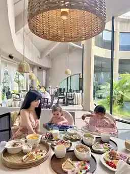 You can take the shuttle bus to the restaurant for breakfast. The breakfast restaurant is so beautiful. You can see the lake view from the floor-to-ceiling windows. I feel great having breakfast here.