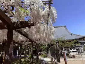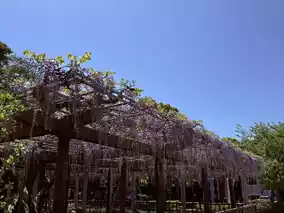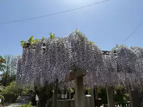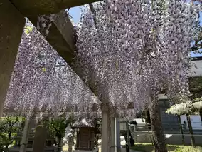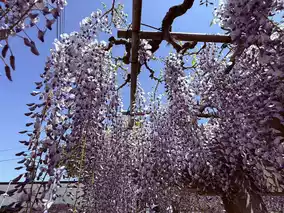 The 'Wisteria of the Lying Dragon' is a purple wisteria. When I visited in late April, about 50% of the flowers had bloomed, with roughly 1/2 to 1/3 of the clusters still in bud form. Full bloom is expected around late April or early May. Besides the Lying Dragon wisteria, the temple also has another smaller wisteria trellis, which was about 80-90% in bloom during my visit, with almost no gaps between the flowers and leaves.