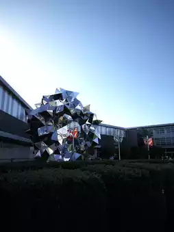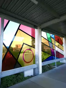 There are some artistic elements outside the airport, with colorful glass windows and round decorations.