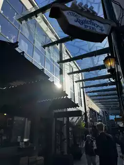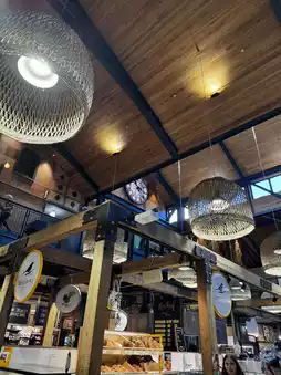 This market is not as "old-school" as a traditional market, the design inside is super thoughtful! The entrance is a clear small lake, the water is so quiet that it reflects the sky blue, next to the colored plastic seats, sitting down to enjoy coffee is very chill; the stalls in the market uniform white simple design, the ceiling hanging strings of warm yellow bulbs, after 3 pm sunlight slanting in, whether taking food or selfies, the background is beautiful to "bring your own filter" ~