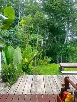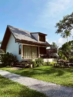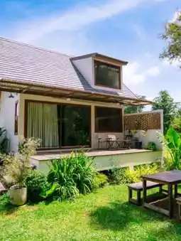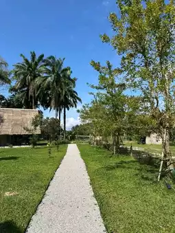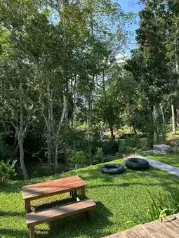 🌴 Around the house comes with a wide, clean lawn that you have to roll on when you reach it. Surrounded by nature, large trees, and the highlight is a waterfall next to the house. You can walk down to play in the water, but you may have to check the water level with the owner again. There is a small path to the waterfall and the palm plantation.
