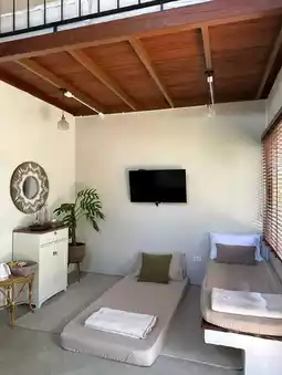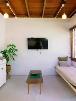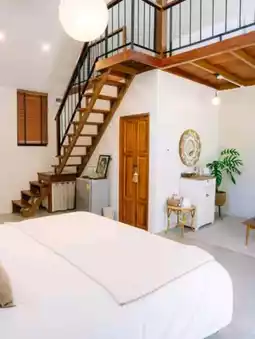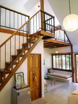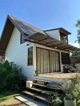 🏡 The only private home. The house that we first saw made us say it was cute about ten times. It is very new and clean. Inside the house, it can accommodate up to 4 people. The upper house has 2 beds under the roof and the lower floor is a large hall with beds, a bathroom, and what we really like is the living area with a table to work on and a seat by the window where you can roll on banana leaves to see the nature outside.