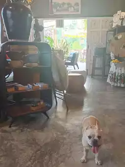 As soon as customers enter the shop, Kanun, a French bulldog, hurries to greet customers from her roost with a friendly expression. We order coffee, and she follows us, as if eager to play with us. Kanun, let's have some coffee and cake first, then we'll play with you.