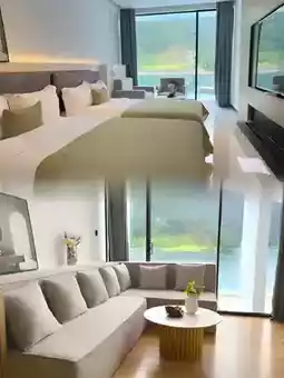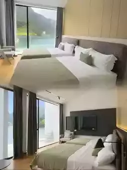 The room is super spacious, the 180° floor-to-ceiling window brings the pool view into the room, the transparent floor-to-ceiling glass window, brings the lake and mountain view of Qiandao Lake to the eyes, and you can also enjoy the private hot spring bath, it's so comfortable after the bath