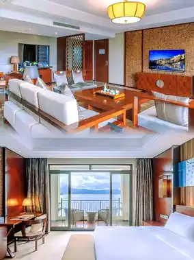 The rooms are designed with a "new Chinese style" concept, fully integrating into the natural scenery, and each room is a scenic view in itself. The decoration is dominated by the color of wood, elegant and simple while maintaining a sense of quality. We stayed in a newly upgraded suite, which not only has ample space for the bed and sofa but also has a dedicated office area. The indoor appliances are smart, and the mirror in the bathroom even has a control screen that can play music and videos, which is really cool! We also visited two other room types, the king room and the twin room, both of which have excellent layouts. You can see Qiandao Lake from the balcony, truly deserving of the name "lake view room"!