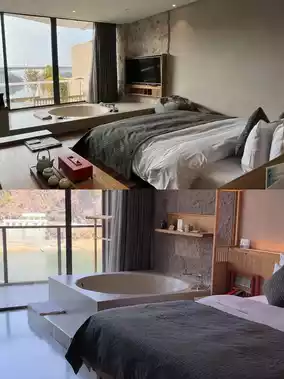 💛The scenic hot spring big bed room is a great choice whether you are with family, best friends, or a couple~ Electric curtains, large-screen LCD TV, tropical rainforest shower, oversized hot spring pool... The meticulous application of smart technology provides you with a home-like experience~