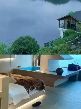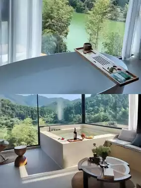 The homestay has floor-to-ceiling windows, and the view is full of greenery, which is very healing. The bathtub and large bed room have a 180-degree lake view, which is super photogenic. There is also a projector. When you are tired, you can lie in the room and it is very comfortable.