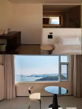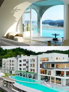 ✔️Santorini-style design with many photo spots. Whether it's the second-floor window seats or arched doorways, everything is picture-perfect. The infinity pool offers panoramic views, and the blue-and-white color scheme makes you want to stay on vacation forever.