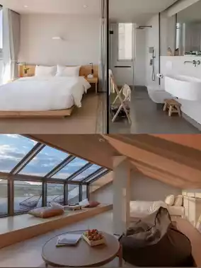 The architecture is uniquely stylish, combining modern simplicity with local rustic charm. The staggered buildings complement the surrounding natural scenery, making you feel like you’ve stepped into a poetic fairy tale.