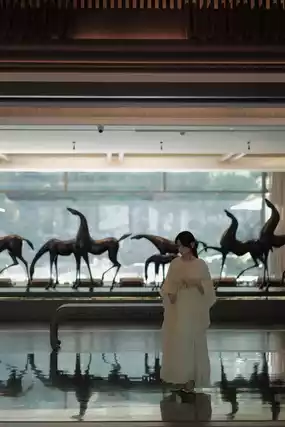 The lobby features a soaring space with grand dimensions. On one side, there is a small exhibition hall housing the owner's precious collections, inviting guests to linger.