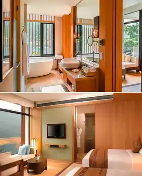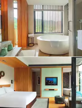 The hotel has only 255 rooms and suites, starting at 50m²! Lake view rooms are recommended! Panoramic floor-to-ceiling windows face the clear waves, with natural wood furniture and light gray soft furnishings for a luxurious feel. Features include intelligent temperature control, ultra-soft latex mattresses with down comforters, bathrooms equipped with panoramic deep soaking tubs, and balcony sofas to enjoy lake views of morning mist and evening glow. Some room types come with children's beds, cartoon-themed bathroom sets, and balcony anti-collision designs for maximum safety and peace of mind.
