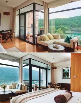 Designed by the American WATG firm! The modern Chinese-style architecture embraces the lakeshore like waves, with floor-to-ceiling windows framing the mountains and water like a giant oil painting. The lobby features a 10-meter-high ceiling and panoramic glass; look up to see layers of green mountains, look down to see rippling blue waves, instantly entering a "landscape gallery" mode. A 37,000m² forest oxygen park! With 90% forest coverage, every breath is full of negative oxygen ions! In spring, pear blossoms cover the hills; in autumn, the scent of oranges lingers, with karst caves and strange rocks scattered throughout!
