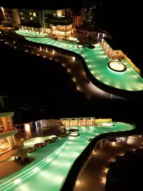 What I liked most was the infinity pool on the cliff edge, especially in the evening when the star lights at the bottom of the pool turn on, making you feel like you're floating in the Milky Way. Every casual shot looks amazing. At night, wearing a black dress under the arch and striking a pose, the photos come out very atmospheric.