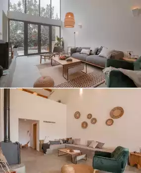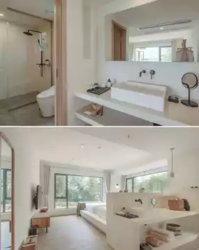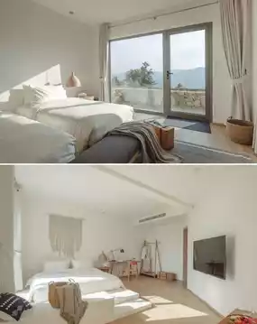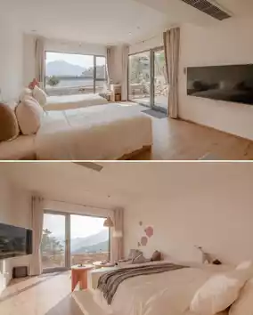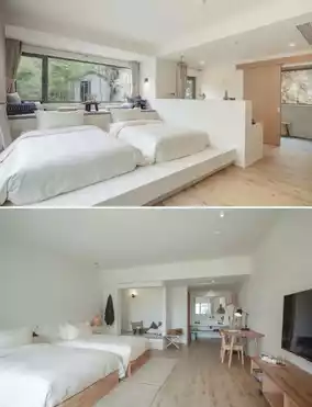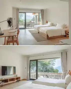 The hotel has a total of 25 rooms distributed across four villas, most equipped with oversized glass windows and terraces/courtyards. The rooms continue the light color scheme design, with solid wood furniture, cotton and linen materials, and floor heating systems creating a warm and comfortable living experience.