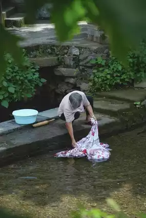 An elderly white-haired woman squats on the bluestone slabs, pounding laundry.
