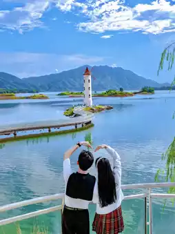 1️⃣ Popular Lighthouse Spot: The lake center lighthouse reflected on the S-shaped glass bridge, autumn blue sky against the clear lake surface, couples holding hands by the bridge, every breeze creates a cinematic atmosphere