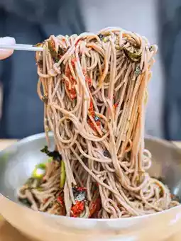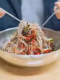 The noodles are made by grinding buckwheat every day,