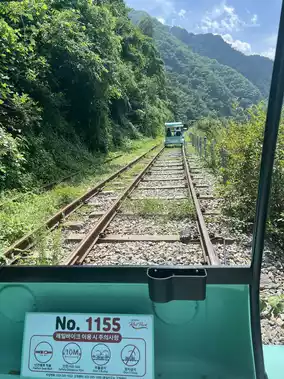 The 8.5-kilometer course starts at Kimyujeong Station and ends at Old Gangchon Station. ❗️ The first 6 kilometers are traveled by rail bike, and the remaining 2.5 kilometers are traveled by romantic train. ❣️