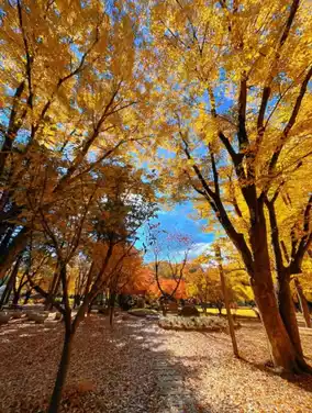 Ginkgo phone booth: A 10-minute walk from the entrance. Golden ginkgo trees paired with a vintage phone booth. Stand under the tree and pose casually to instantly become the female lead of a Korean drama.