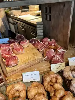Addictive side dish donuts Maple prosciutto A side dish donut with a generous slice of prosciutto A donut coated with plenty of homemade maple glaze The sweetness and saltiness of the prosciutto are delicious.