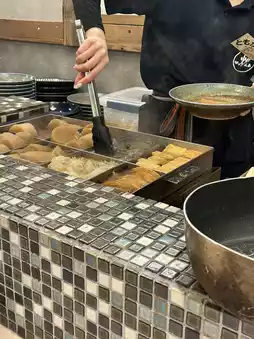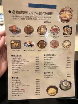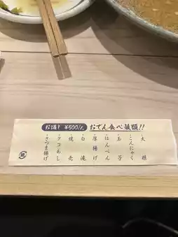 This is my second visit to this popular restaurant that serves all-you-can-eat oden for 550 yen. I stopped by when I was traveling in Fukuoka, and the restaurant was very busy even though it was a weekday, so it seems better to make a reservation on weekends. First, a full set of oden was served as an appetizer 🍢 The octopus was bigger than I expected, plump and delicious. The shumai recommended by the restaurant staff was also quite tasty. There is an oden corner in the middle, and you can take a plate and have more. I especially enjoyed the delicious octopus and shumai, so I had to have more than one. The restaurant has a counter, tables, and a room that looks like a private room. The staff are very energetic and nice. It's a shame that I couldn't eat or drink much because I had eaten and drank a lot at the first place. Next time, I'd like to eat a lot on an empty stomach lol Thank you for the meal. Menu ordered: Oden 550 yen All-you-can-eat sweet potato with butter and honey 480 yen Yakitori 5-piece set (ponjiri, chicken thigh, gizzard, chicken neck, chicken skin) 890 yen Black oolong tea Jasmine tea