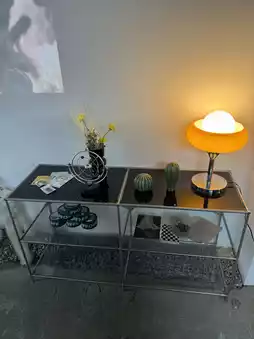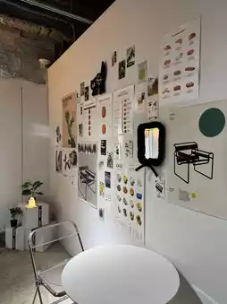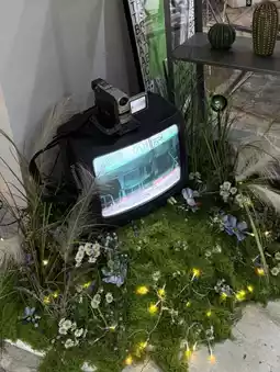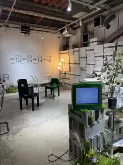 The interior features a raw concrete design complemented by the café's theme color, green, and playful decor. There's even an old-fashioned CRT television on display.