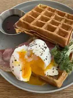 Recommended! BACON EGG Waffle (1,400 yen): A freshly baked waffle topped with a poached egg, crispy bacon, cream cheese, sprouts, and maple syrup. The slightly sweet waffle base pairs perfectly with the savory toppings and maple syrup for a delicious combination.