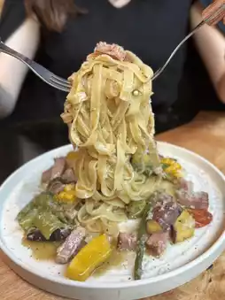 The natural pork bacon pasta was hearty and satisfying. 🙆♀️ The bacon was absolutely delicious. ❤️