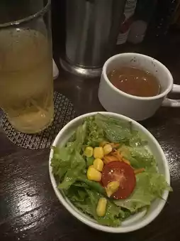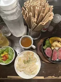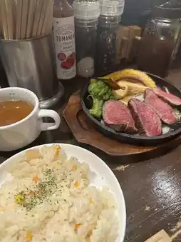 The set menu is steak + soup and salad, and you can choose white rice or pilaf!
