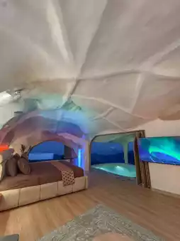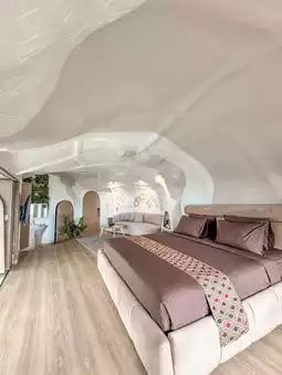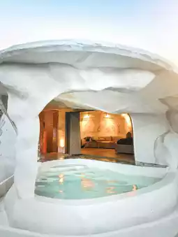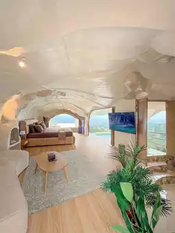 "Mantra" by Gua Bandung, a unique resort located in Cimenyan, Bandung Regency. This resort is known for its cave-like room design, providing a unique and engaging stay experience. Located in Cimenyan, Bandung Regency, this resort offers beautiful natural views, including views of the Bandung city lights at night. Some rooms come with private hot tubs, and the lighting can be adjusted to create different ambiances.