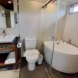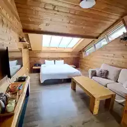 The stargazing double room we stayed in is located on the upper floor. The room is large, with a wooden design, a comfortable environment, and a bathtub in the bathroom for bathing. The most special thing is that the roof is designed with transparent glass. You can see the sky while lying on the bed, which feels magical.