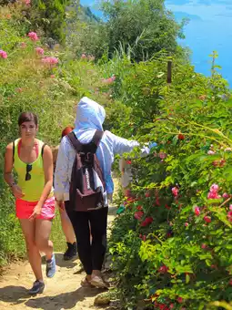 The trail is quite challenging, with steep, uneven steps that make the hike demanding, but the stunning coastline views and panoramic scenes of Monterosso and Vernazza are well worth the effort. The path winds along cliffs, offering breathtaking glimpses of the sparkling blue Mediterranean below. We took much longer than expected as we paused to admire the wild beauty of the landscape—vibrant red poppies, fluttering butterflies, and rows of lush vineyards lining the hillsides.