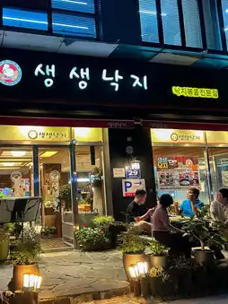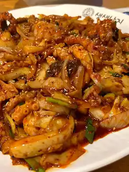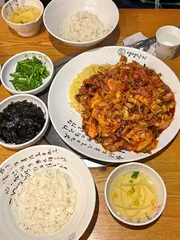 Near Spaland, the sauna session ended around nine o'clock, so we hurried over to eat. I was afraid it would be too spicy, so I asked my aunt, and it seemed like they could make it non-spicy. I wanted to order spicy fried octopus, but I told my aunt that it should be moderately spicy. Basically, the spiciness cannot be adjusted, and we asked proactively!