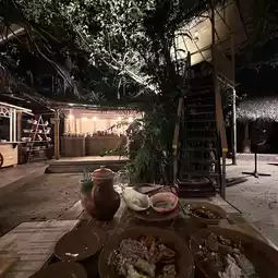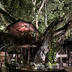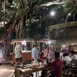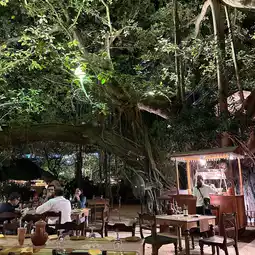Dining under the grand banyan tree amidst live music creates an unforgettable atmosphere.