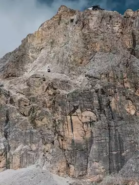 Mount Lagazuoi in the Dolomites of northern Italy. A cable car ascends the rocky face of the mountain, leading to the summit where the Rifugio Lagazuoi mountain hut and the top station of the cable car are located.