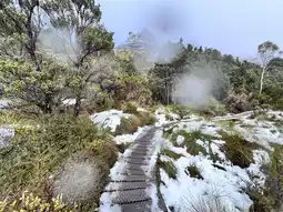 Difficulty Level: Grade 3 – Recommended for those with basic bushwalking experience. The path includes short steep sections, uneven surfaces, and several stairways. Additionally, be cautious of water flowing along the trail, especially since snow during our visit caused water to stream across the path.