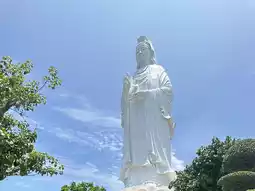 It is home to a large white cement statue of Guanyin, standing with her back to the mountain and facing the sea to protect fishermen who go fishing. The sound of the temple bell that rings in harmony with the sound of the waves helps the sailors feel calm and is very famous for praying for health, business, safety and children.