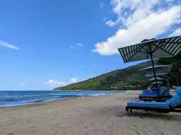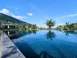 The 70-meter-long private beach has blue sea, white sand, sunshine, palm trees, and lazy and relaxing beach chairs, so you won’t feel tired even if you lie there all day. The resort also has two infinity pools, overlooking the endless sea view and the rooms stacked among the mountains.