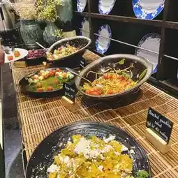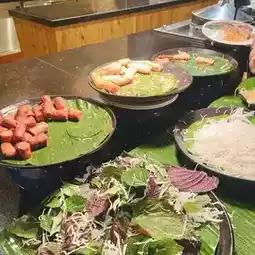 🍽️La Crique Restaurant: Dinner buffet starting at 469,000 VND per person. The food is diverse and international. There's pizza, sausage, pho, fermented pork, som tam, cheese, cold cuts, salads, fruit, desserts, soups, seafood, shrimp, and shellfish. The food was very fresh. The breakfast buffet was also served here. The food is just as plentiful! 🍕
