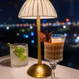 This rooftop bar offers a spectacular view, including the Dragon Bridge and the buildings along the Han River at night, illuminated Ferris boats passing by on the Han River, and a Ferris wheel on the other side.