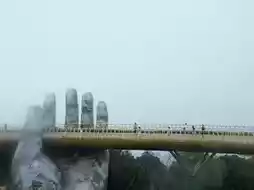 A golden sky bridge with giant hands holding it, also on Ba Na Hills.