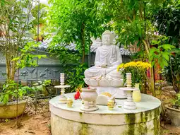 If you ride a motorbike from Da Nang in central Vietnam to the local area near the Marble Mountains, you will find Hoang Vien Temple, a beautiful garden with many Buddha statues and well-groomed trees. It is a cute temple with a pretty garden.