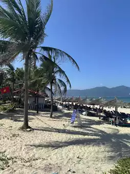 The family trip to My Khe Beach was really the best! 🏖️ The scenery of the blue sky and palm trees was like a painting. 🌴 The kids had fun running around on the fine sandy beach, and we had a happy time leisurely walking along the beach. 👣