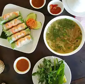 A restaurant with a beautiful garden where you can taste various local dishes. The food is so clean that it feels like you're eating home-cooked food. The spring rolls with large shrimp are especially delicious!