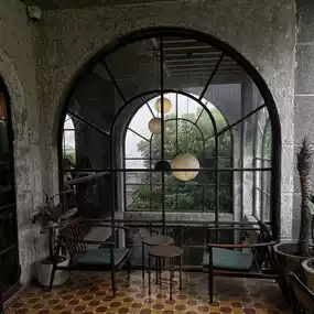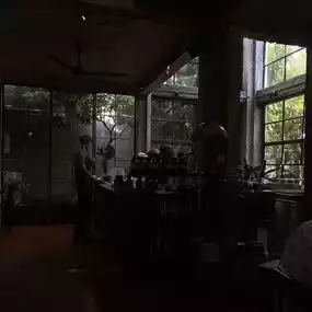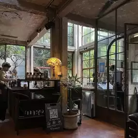 ร้านมี 2 ชั้น กว้างโปร่ง แบ่งพื้นที่สวนเขียว และโถงอินดอร์สูงโปร่ง ตกแต่งด้วยคอนกรีตเปลือย เหล็กและไม้ มอบอารมณ์ดิบ–อบอุ่น กลางวันแสงธรรมชาติเข้าเต็มกำลัง — perfect สำหรับทำงานหรือชิลล์ชิลล์ all day ([turn0search0],[turn0search1])