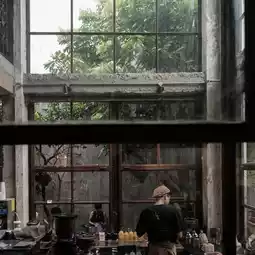 The shop is divided into two main zones: a shady garden zone full of fresh green trees and an indoor zone decorated with exposed concrete, steel and wood, giving a raw but still warm atmosphere. It stands out with large arched windows that allow plenty of natural light, adding airiness to the shop. It is suitable for working or chilling with friends all day long.