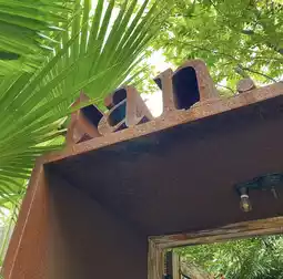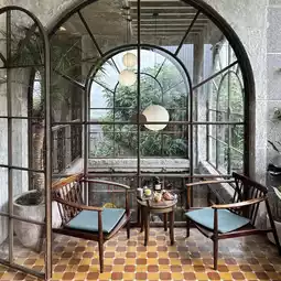 The shop is divided into a green garden zone 🌳 refreshing with an indoor zone decorated with exposed concrete, steel, and wood 🪵 giving a raw, cool, but still warm feel 🌞 plenty of natural light, perfect for chilling out, working, or taking cool photos 📸