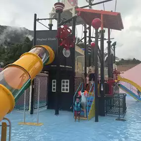 A stylish resort restaurant with a unified yellow and light blue color scheme!