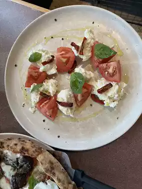 You can order half and half pizzas. The cheese, dough, and toppings are all high quality, and the oven-baked pizzas were perfectly done.