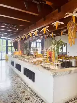 Mercure Danang French Village Bana Hills is the sole hotel located atop the mountain for those visiting Ba Na Hills in Vietnam. Room prices vary depending on the number of guests, with options for 2-person rooms, 4-person rooms, and family rooms. The cost per person is approximately 1,500-1,700 THB. This price includes access to most of the attractions and a buffet breakfast featuring a mix of international cuisine and local Vietnamese dishes. However, it does not include the cable car fare for ascending and descending the mountain, which costs an additional 600 THB per person but is offered at a special rate for hotel guests. For anyone exploring Ba Na Hills, it is highly recommended to book a stay at the hotel on the mountain. The area is vast, allowing you to leisurely enjoy the views and capture stunning nighttime photos with beautiful lighting. Morning views are particularly serene as the first group of tourists has yet to arrive.